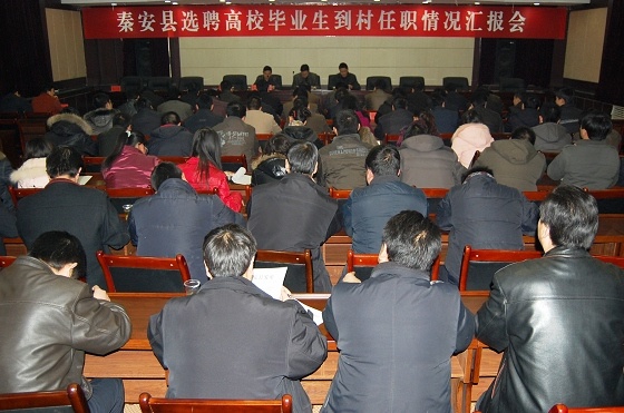 1月17日,秦安县召开选聘高校毕业生到村任职情况汇报会。会议由县委组织部副部长李永忠主持,县委常委、组织部长郭海军作了重要讲话。参加会议的有各乡镇党委书记、组织干事、县委组织部干部、选聘到村任职的高校毕业生等共90多人。会上, 21名选聘大学生村官到会就到村任职情况进行了汇报发言。