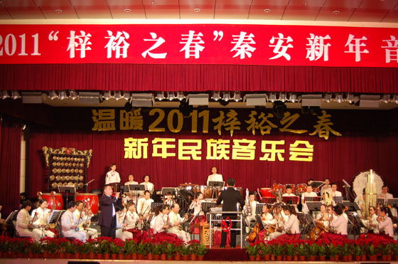 12月30日晚,由中共秦安县委、秦安县人民政府主办,县委宣传部、县文化旅游局、县广电局承办,天水梓裕热力有限公司、天水冠源果业有限公司协办,甘肃省歌舞剧院民族交响乐团与天水羲皇故里民族乐团联袂演出的2011“梓裕之春”新年音乐会在秦安行政中心礼堂隆重上演。