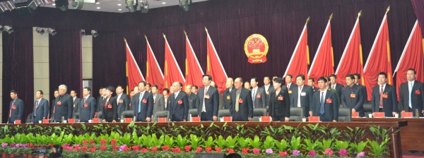 行政中心礼堂灯光敞亮,肃穆辉煌,主席台前花团锦簇,焕然一新。主席台帷幕中央悬挂的巨大国徽在十面红旗的映衬下熠熠生辉,整个会场庄严神圣。