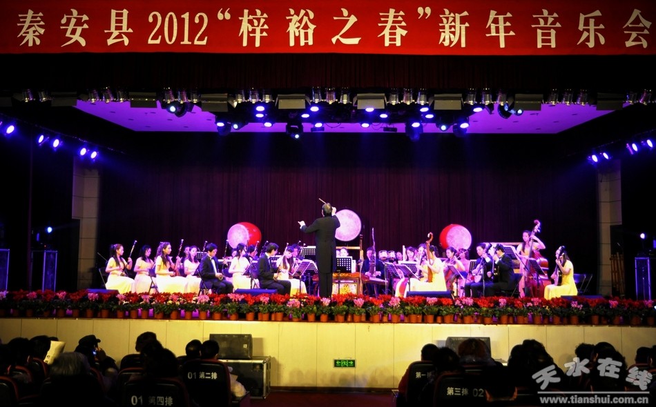 倾情奉献视听盛宴,全力升华艺术享受。2011年12月27日晚8时,秦安县行政中心二楼礼堂座无虚席,灯光辉映。由秦安县委、县政府主办,县委宣传部、县文化广播影视局承办,天水梓裕热力有限公司协办,中国东方民乐团主演的“梓裕之春”2012秦安新年音乐会,奏响了秦安县“两节”群众文化活动的序曲。
