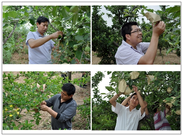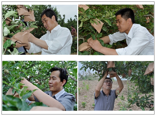 在村民刘万录家的果园里,经过其妻子李小琴的现场演示,大家开始套袋。虽然干部们对套袋不很熟练,但是他们能吃苦,有耐心,认真细致,半天下来,累计套袋4000多只,受到果农们的称赞。