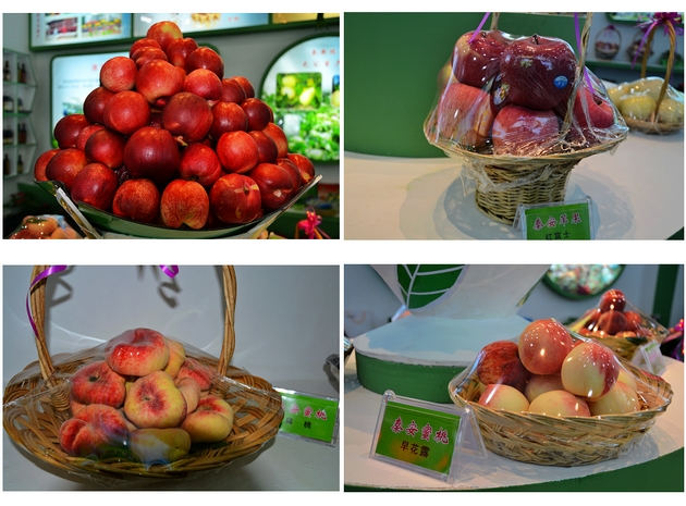 展馆正中的圆形展台最高处是鲜艳欲滴的“秦安油桃”,下面分层是“早花露”蜜桃、“秦安扁桃”,“黄金帅”、“红富士”苹果、“秦安早酥梨”,“秦安脆瓜”、“秦安西瓜”。左右两边展台分别是“街泉庄系列香醋”、“秦安水晶粉条”、“秦安浆水”、“秦安花椒” 系列,“大地湾系列酒”,“可泉山鸡蛋”,“秦安草编”及“麦秆画”。整个展馆布置得体,特色鲜明,美观大方。