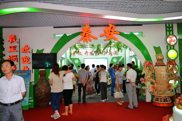 走近秦安展馆,鲜红的大字“羲里娲乡欢迎您”引人瞩目,硕大的人头瓶矗立在左侧,昭示着8000年古老的文明,另一侧是秦安工艺草编“二龙戏珠”,所有图案全用麦秆编制而成。展馆内部,以特色产品与灯箱图片、文字说明相结合,内容丰富,高雅亮丽,全方位立体式介绍秦安近年来林果产业的辉煌成就,突出展示了“秦安三宝”——苹果、蜜桃和花椒,以及其它特色产业快速发展的概况。