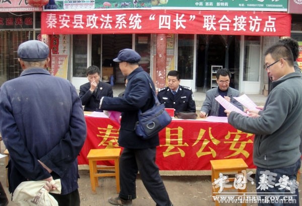 积极开展“四长”联合接访活动。近年来政法委组织政法各部门主要领导、业务骨干,先后在全县各乡镇开展“四长联合接访”活动45次,接待上访群众2924人次,处理问题105个,化解矛盾纠纷157起,散发宣传资料9万多份。