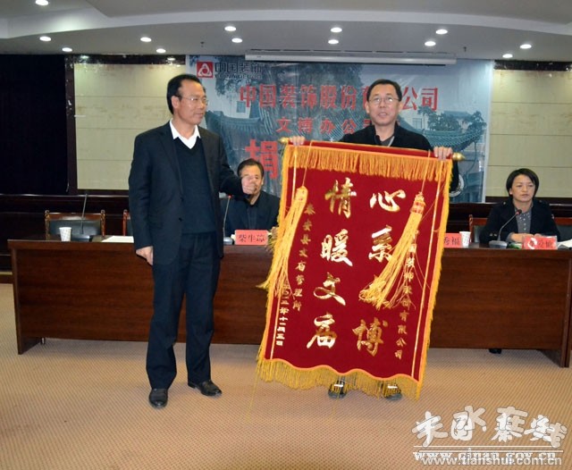 捐赠仪式上,中国装饰股份有限公司为秦安县文庙管理所捐赠了价值人民币5万元的文博办公器材;国家文物局党办主任尹建明,中国装饰股份有限公司总经理张秀福,甘肃省文物局办公室主任柴生璋分别作了讲话;县文物局负责人代表县文博系统向中国装饰股份有限公司赠送了锦旗。