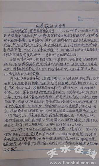 今年22岁的雒骞家住秦安县西川镇雒堡村,2010年的9月,毕业于秦安县一中的他考入天津商业大学商学院人力资源管理专业学习。今年5月22号,持续高烧的他在中国医学科学院血液病医院被诊断为“急性淋巴细胞白血病”。