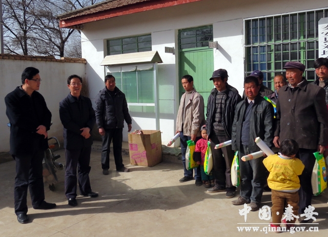1月24日,新春佳节即将来临,为使“双联”村的困难群众度过一个愉快的节日,市委宣传部副部长赵子洲带领机关“双联”干部一行5人来到联系的秦安县刘坪乡陈寨村、赤山村,对困难群众开展节前走访慰问活动,为他们送去党和政府的关怀和祝福,为每户困难家庭带去了大米等慰问品。