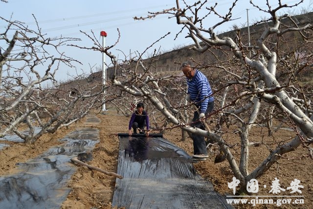 (刘坪乡何湾万亩优质蜜桃基地果农正在覆黑膜)