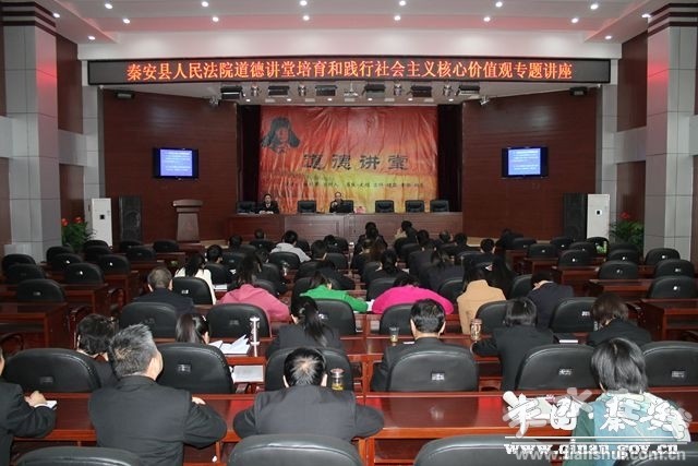 “作为法院和法官,我们需要在审判实践中落实司法为民公正,在审判活动中遵循社会主义核心价值观要求,正确适用法律法规,在定纷止争过程中弘扬和推广社会主流价值,做到讲社会责任、讲社会效益,讲守法经营、讲公平竞争、讲诚信守约,培育社会主义法治文化,充分发挥法律的规范、引导、保障、促进作用,形成有利于培育和践行社会主义核心价值观的良好法治环境。”当问及如何进一步践行社会主义核心价值观时,秦安县人民法院的负责人如是说。秦安县人民法院为了帮助广大青年法官深刻理解社会主义核心价值观的内涵,于4月18日举办了培育和践行社会主义核心价值观专题讲座。讲座令全院干警感触深刻,大家纷纷表示,要把社会主义核心价值观体现在各项司法实践中,以高超的司法智慧、熟练的司法技能、文明的司法行为守护好社会公平与正义这道防线。
