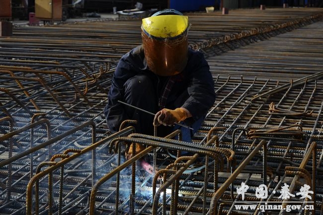 记者在中铁十七局秦安段西川镇制梁场建设工地看到,十几位工人有的正在绑扎桥面钢筋,有的正在焊接桥梁顶板,焊花飞溅,他们在炎热的阳光下紧张地工作着。来自山东省的李师傅是焊接组的工人,他告诉记者,自从干这行后,他们就没休息过一天,五一期间,工人们加班加点修铁路,希望能早点竣工,回老家一趟。这样干了多年,在他的脑海里,已经没有节假日的概念了,“工程节日不停工,自己又要挣钱,没办法啦!”李师傅憨憨地笑了笑。