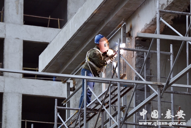 在县城一处建设工地现场,50多名工人正在紧张地施工,机器的轰鸣声不绝于耳。由于常年在户外工作,37岁的建筑工人张师傅皮肤被晒得黝黑,看起来比实际年龄大了一些。记者见到他时,他的脸上和衣服上已溅满了水泥点,阳光下皮肤被晒得“黑里透着红”,笑起来露出了白白的牙齿。他每天的工作就是对钢筋连接点进行焊接,由于长期和钢筋打交道,他的手上沾满斑斑锈迹,指甲缝里也都是黑色的,手上不少地方都生起厚厚的老茧。