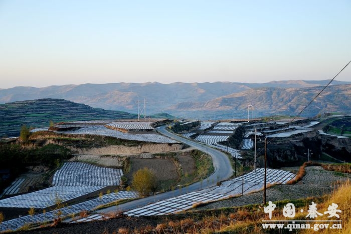 10月21日,在秦安县五营乡牛蹄湾流域的田间地头里,10多名农技人员和干部正指导帮助农民挖沟、起垄、覆膜,开展秋季覆膜工作。在大家齐心劳动下,一块新平整的土地转瞬间已是满眼银色。