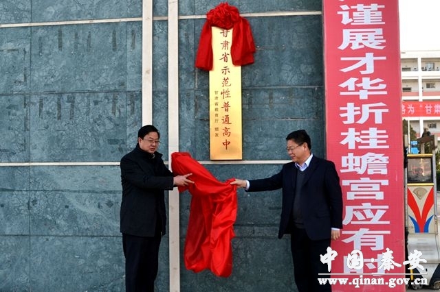 (天水市副市长张建杰、县委书记王东红为“甘肃省示范性普通高中”揭碑)