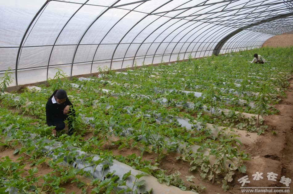 4月7日,秦安县五营乡雒塬村的村民正在日光温室大棚内为瓜苗打杈。