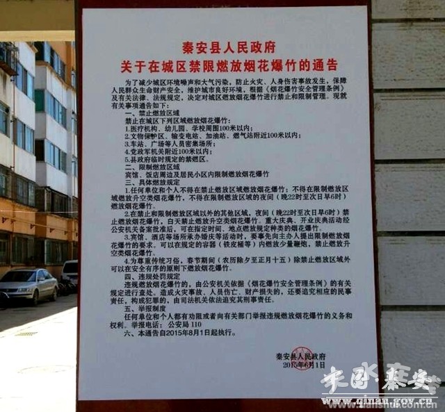 为了减少城区环境噪声和大气污染,防止火灾、人身伤害事故发生,保障人民群众生命财产安全,维护城市良好环境,根据《烟花爆竹安全管理条例》及有关法律、法规规定,秦安县人民政府于2015年6月1日发出关于在城区禁限燃放烟花爆的通知,决定从8月1日开始,对城区燃放烟花爆竹进行禁止和限制管理。