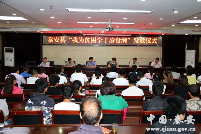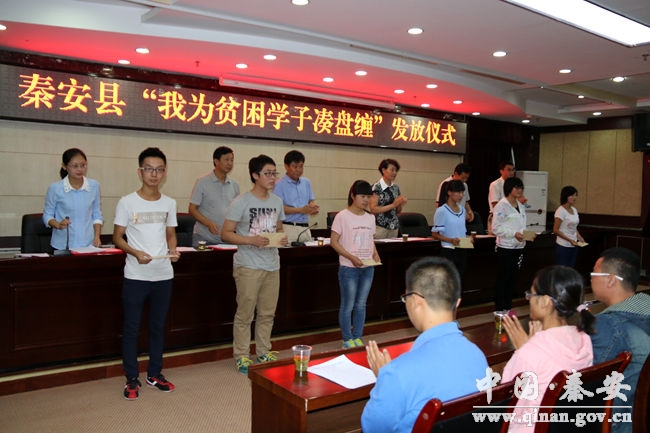 9月1日上午,秦安县举行 “我为贫困学子凑盘缠”活动盘缠发放仪式,县人大常委会副主任刘小秦,县政府副县长罗增芳,县政协副主席马振寰,团县委、县教体局负责人,相关爱心企业、爱心人士、公益志愿者和41名贫困学子参加发放仪式。