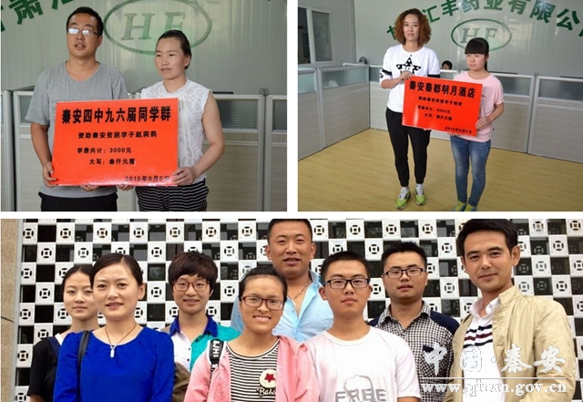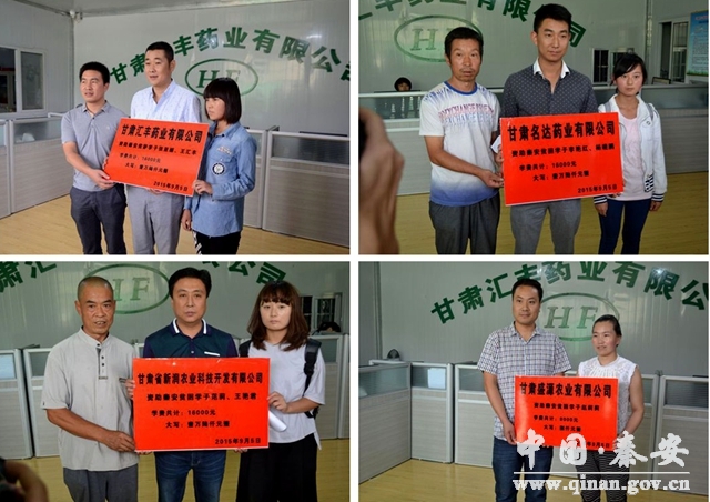 9月4日,在甘肃汇丰医药有限公司总经理靳国荣先生的积极倡议下,甘肃新润农业科技开发有限公司、甘肃名达药业、秦都明悦酒楼、甘肃盛源菊香农业发展有限公司、秦安县第四中学96届同学会等5家爱心企业和1家集体积极响应,共捐出6.7万元作为助学金,用于帮助王汇丰、张亚丽等8名特困学子顺利完成学业,这8位学子在校期间每年将得到助学款2000元;秦安县第四中学96届同学会一次性捐助赵莉莉同学3000元。