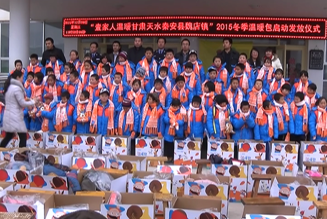 12月9日,壹家人温暖甘肃天水2015冬季温暖包发放仪式在秦安县魏店镇中心小学举行,此次温暖包的发放,是天水市公安局在魏店镇陇滩村的帮扶队发起,并协调团市委,联系了“壹基金”的公益小分队利贞公益助学协会,协调帮扶了价值365元的温暖包61个,并和天水陇右环境保育协会、秦安华世五菱宝骏4S店带来了价值2万元的学习用具和文体用品。