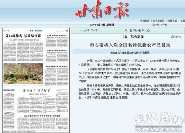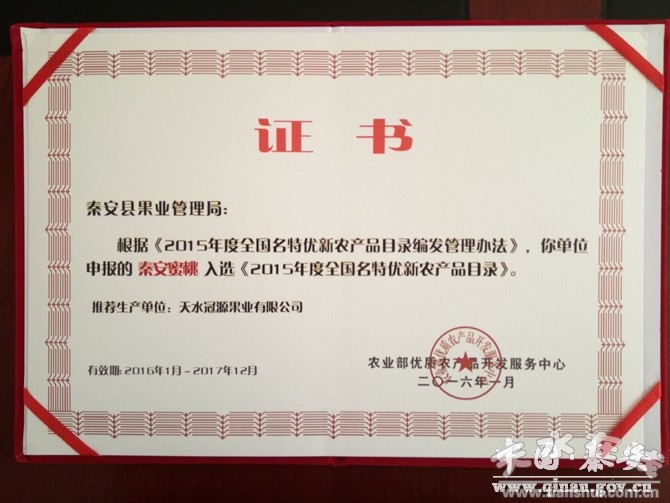 近日,由农业部优质农产品开发服务中心正式发布的《2015年度全国名特优新农产品目录》中,秦安县申报的“秦安蜜桃”成功入选。