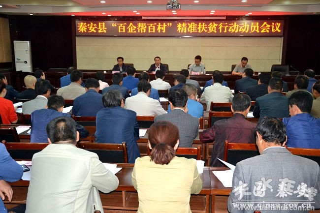 6月3日,秦安县召开“百企帮百村”精准扶贫行动动员会,对企业帮扶支持精准扶贫工作进行动员部署。各有关乡镇党委书记(或乡镇长),贫困村的村支部书记和驻村帮扶队队长,联系帮扶贫困村的企业负责人,县工商联、扶贫办全体干部职工共80多人参加会议。
