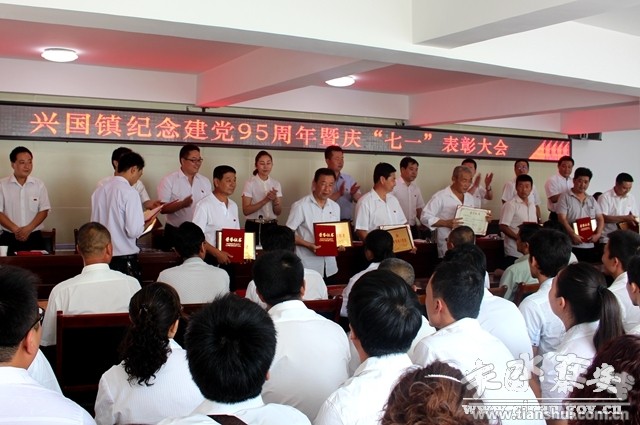 7月1日,兴国镇组织党员开展庆“七一”系列活动,共同庆祝中国共产党成立95周年。上午,兴国镇召开 纪念建党95周年暨“七一”表彰大会,表彰了在推动发展、服务群众、凝聚人心、促进和谐、扶贫攻坚和党的建设中涌现出的业绩突出、群众公认的先进基层党组织、优秀党务工作者、优秀共产党员和优秀干部。进一步激励全镇基层党组织和广大党员干部继承和发扬党的优良传统,激励士气,鼓舞干劲,扎实工作,团结拼搏,更好地发挥战斗堡垒作用和先锋模范作用。下午,镇党委班子成员参加了各支部开展的庆祝活动,为党员送去了“两学一做”便学手册和宣传挂历。