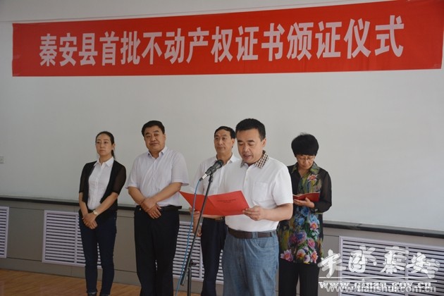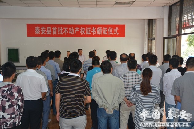 8月30日,秦安县举行首批不动产权证书颁证仪式,标志着全县不动产统一登记发证工作正式启动。天水市国土资源局党组成员、副局长田永和,秦安县委副书记、县长程江芬,县委常委、政法委书记杨喜春,市国土资源局不动产管理科、县政府办、编委办、农业局、林业局、住建局、财政局、房管局、畜牧局、国税局、地税局主要负责人,不动产权人代表和三和数码测绘院工作人员及县国土资源局干部职工代表共计30多人参加了颁证仪式。县委常委、常务副县长任佩光主持颁证仪式。