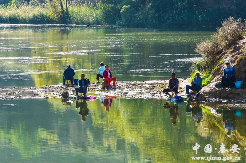 采风组一行从五营镇大地湾驱车二十多分钟便来到苏家峡水库。一下车,峡谷的景色让人心旷神怡,水库的壮观令人惊叹不已。时值下午,阳光灿烂,白云在蓝天下飘浮,空气清新,微风轻轻地吹拂。巨大的库区像一面巨型的镜子,在阳光下波光粼粼,非常耀眼。水库周围青山环抱,绿树绕堤,果蔬溢香,各种树叶在阳光下金光闪闪,库中的倒影若隐若现,非常迷人。水库的四周聚集着好多的钓鱼爱好者,他们在尽情的感受着这里的美景,享受着收获的快乐。苏家峡峡谷幽深,水库西南面是一望无际的芦苇林,金黄色的芦苇随风摇曳,像一块巨型的地毯在起伏飘动,煞是好看,非常漂亮。