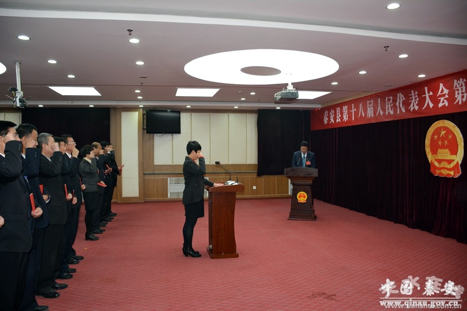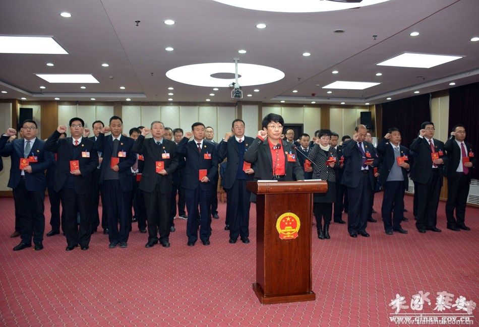 10月25下午,在秦安县第十八届人大一次会议胜利闭幕后,举行宪法宣誓仪式。新当选的县第十八届人大常委会主任、副主任、委员,县人民政府县长、副县长及县法院院长向宪法庄严宣誓。