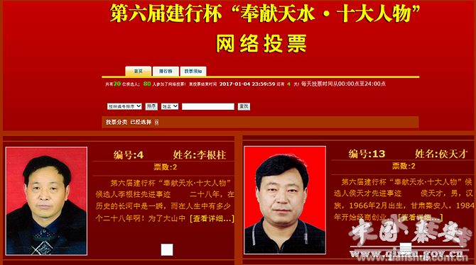 12月31日,第六届建行杯“奉献天水·十大人物”评选投票活动正式开始,秦安县莲花镇红崖教学点教师李根柱,甘肃天麟房地产开发集团有限公司董事长、甘肃金黄河笔业有限公司总经理侯天才两人被确定为候选人,欢迎社会公众踊跃投票。