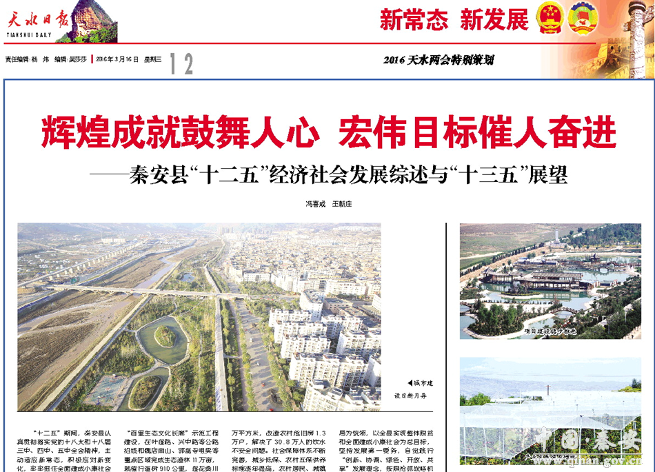 一是重大主题宣传导向鲜明。牢牢把握正确导向,精心组织开展了经济建设、深化改革、“两学一做”学习教育活动等重大主题宣传活动。在中国·秦安网、天水在线网策划推出了“辉煌十二五”、“项目建设”、“先锋行动”等专题报道,在报刊、网络等媒体上刊发了《辉煌成就鼓舞人心 宏伟目标催人奋进——秦安县“十二五”经济社会发展综述》、《和谐发展万象新 惠民甘露润民心》、《旱塬变沃野 三农奏华章》、《同心协力拔穷根 精准扶贫奔小康》、《四轮驱动产业兴 增收富民道路宽》、《教育改革的甘肃“秦安样本”》、《秦安开展系列活动 促进“两学一做”学习教育》等稿件,全方位宣传了全县经济、政治、文化、社会、生态文明建设和党的建设等方面取得的巨大成就,进一步激发了全县上下干事创业的热情和活力,唱响了改革发展的主旋律。