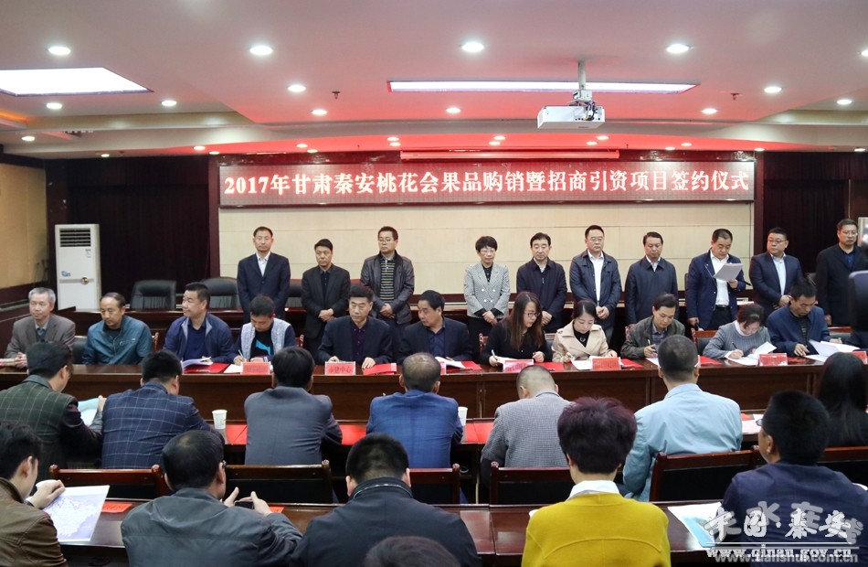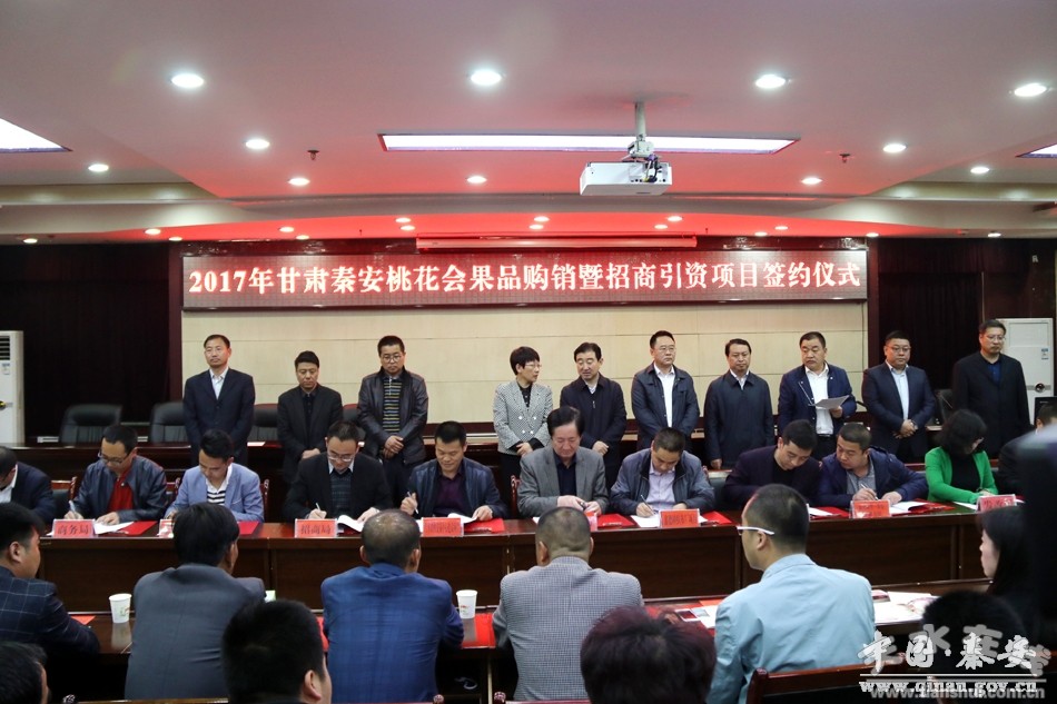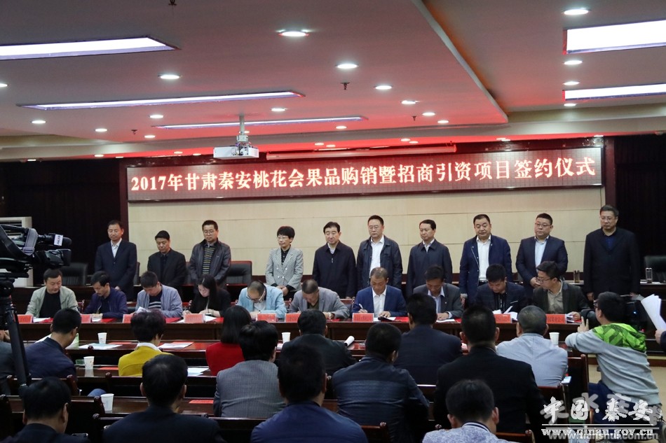 4月18日上午,2017年甘肃秦安桃花会果品购销暨招商引资项目举行签约仪式。市政府副市长霍卫平、市招商局副局长贾兆贤、市果业办副主任杨春蕾,秦安县委副书记、县长程江芬,县委副书记裴贵军、县人大常委会副主任张耀清、县政府副县长丁迟成、王玉安,县政协副主席路福太,以及外地秦安商会代表、外地投资秦安客商代表,县内企业家代表、重点签约项目业主,经济界、新闻界的朋友们和各乡镇、县直有关部门负责人参加了签约仪式。签约仪式由县委常委、政法委书记杨喜春主持。