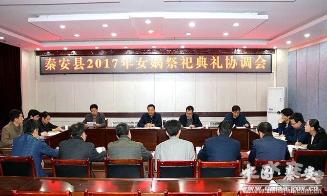4月19日,秦安县召开2017年女娲祭祀典礼协调会,协调女娲祭祀典礼活动具体事宜,各参会部门、单位围绕各自工作提出了具体意见建议。县委常委、宣传部长徐东明对女娲祭祀典礼筹备工作进行了安排部署。