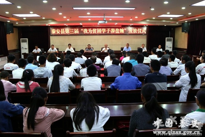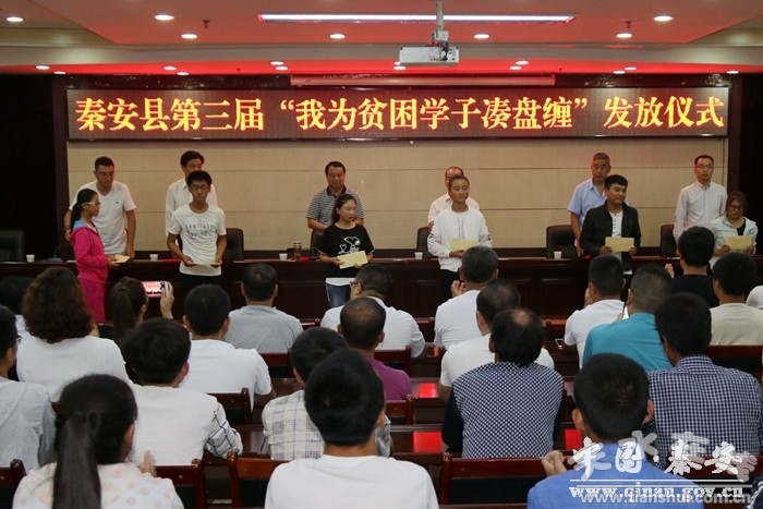 8月24日,秦安县第三届“我为贫困学子凑盘缠”发放仪式在行政中心北三楼会议室举行。县委副书记裴贵军,县政协副主席张荣生,县委农工部、县委关工委、团县委、县教体局等单位相关负责人,部分爱心企业和爱心人士代表、志愿者、受助学生共120余人参加了发放仪式。