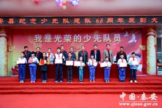 为隆重纪念中国少年先锋队建队68周年,近日,秦安县举行纪念少先队建队68周年表彰大会,对全县优秀少先队员、少先队辅导员和少先队集体集中进行表彰。县政协副主席张荣生,团县委、县教体局、县人社局、县少先队总辅导员,17个镇团委书记、少先队总辅导员,12个直属中小学少先队大队辅导员、28所农村初级中学团总支书记,受表彰的先进集体和个人及兴国三小全体师生参加了表彰大会。