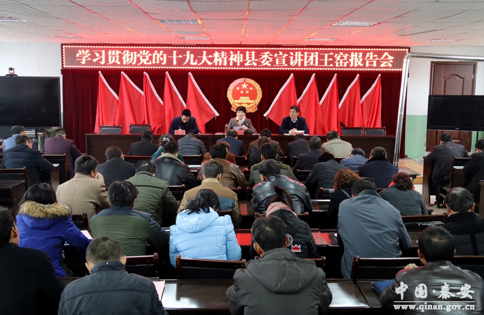 12月13日,秦安县委副书记、县长程江芬在王窑镇宣讲党的十九大精神。县政府办负责人、王窑镇全体干部、镇属各单位代表聆听了宣讲报告。