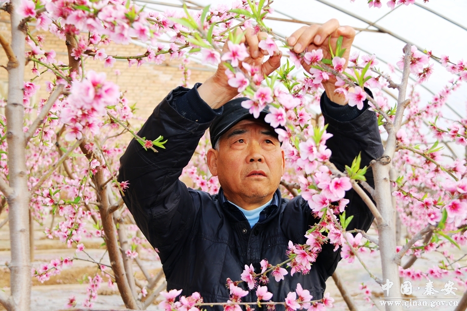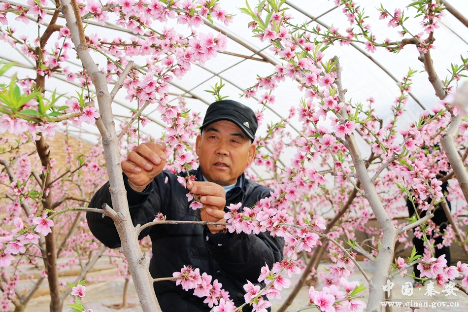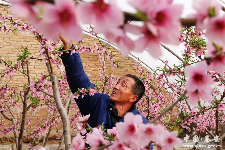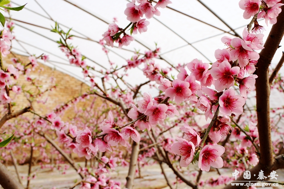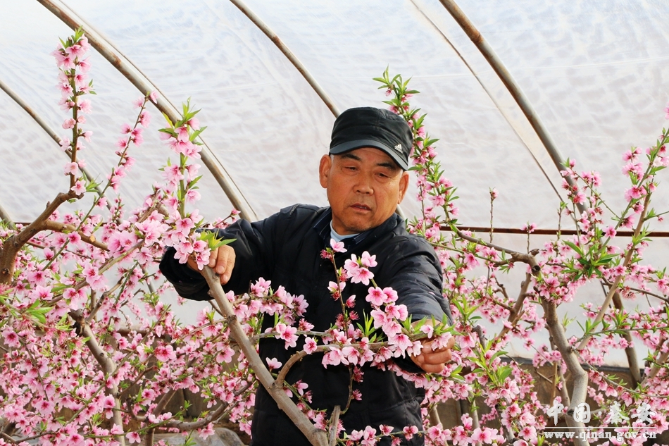棚外,寒风凛冽,草木萧萧;棚内,温暖如春,桃花怒放……近日,记者走进秦安县五营镇大地家园果蔬专业合作社的日光温室大棚看到,一株株桃花迎春绽放,争奇斗艳;一畦畦蔬菜绿意盎然、茁壮成长;工人们个个忙着匀花疏果、培育新苗,粉嘟嘟的桃花、绿油油的蔬菜、忙忙碌碌的工人,好一派人勤春早、生机盎然的景象……