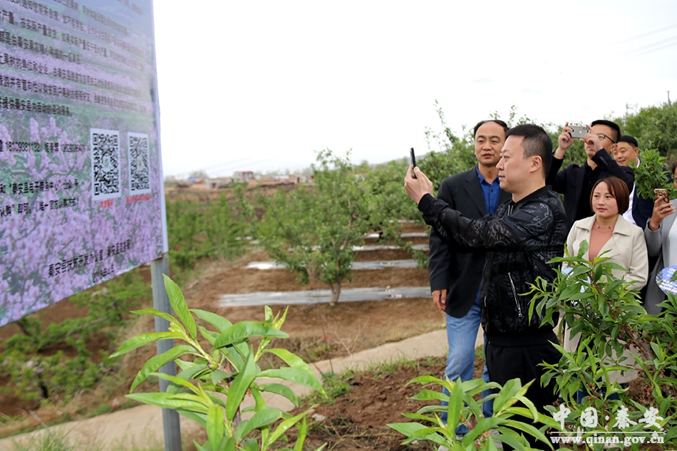 马琳现场用手机扫码秦安认购果树倡议书公众号,分别认购了秦安蜜桃树、秦安苹果树和秦安花椒树各1棵,将亲笔签名的“秦安爱心果树认购牌”悬挂所选果树并合影留念。