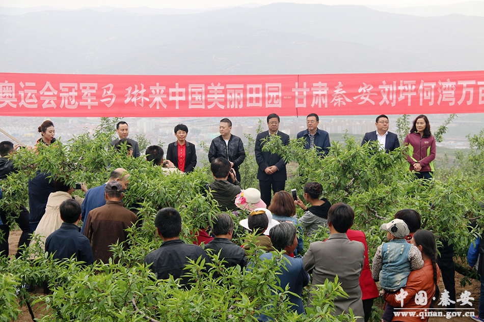 在刘坪何湾万亩桃园,举行了果树认购活动仪式。县委书记王东红为马琳颁发了荣誉证书。县委副书记、县长程江芬在致辞中说,马琳先生来秦安县认购果树,这不仅是对秦安县脱贫攻坚的大力支持,也是对秦安经济社会发展的关心关爱。通过马琳先生的亲身参与和积极推动,我们相信会有更多的社会爱心人士投身于这一活动、助力脱贫攻坚。同时,我们将不断加大宣传推介力度,进一步提升品牌质量,完善产业链条,真正把这一活动打造成富民增收的一大创举,如期实现脱贫摘帽、全面建成小康社会。