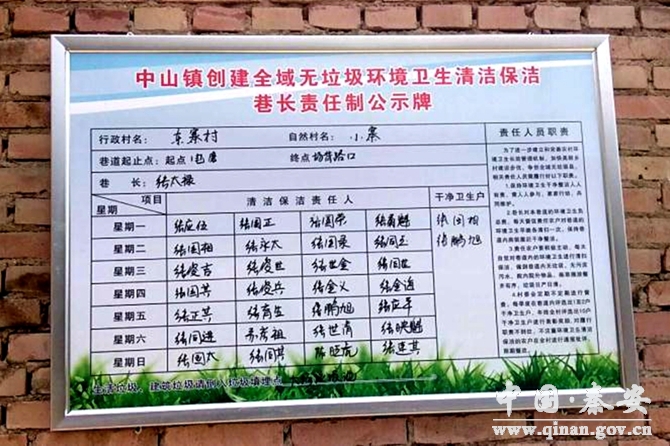 完善制度机制,建立新常态。镇政府通过制定印发《中山镇环境卫生综合整治实施方案》、《中山镇全域无垃圾治理工作考评办法》、《中山镇全域无垃圾治理工作问责办法》和《全域无垃圾网格化管理的通知》等文件,成立环境卫生综合整治领导小组、环境卫生综合整治督查组和各行政村环境卫生村干部包组包片工作组等措施,逐步构建了“镇主要领导负总责,分管领导全面抓,包片领导分块抓,驻村干部、村干部直接抓,组干部、保洁员具体干”的五级网格化管理体系,进一步靠实了管理责任、细化了工作任务,在全镇逐步形成了环境卫生整治的常态化机制。