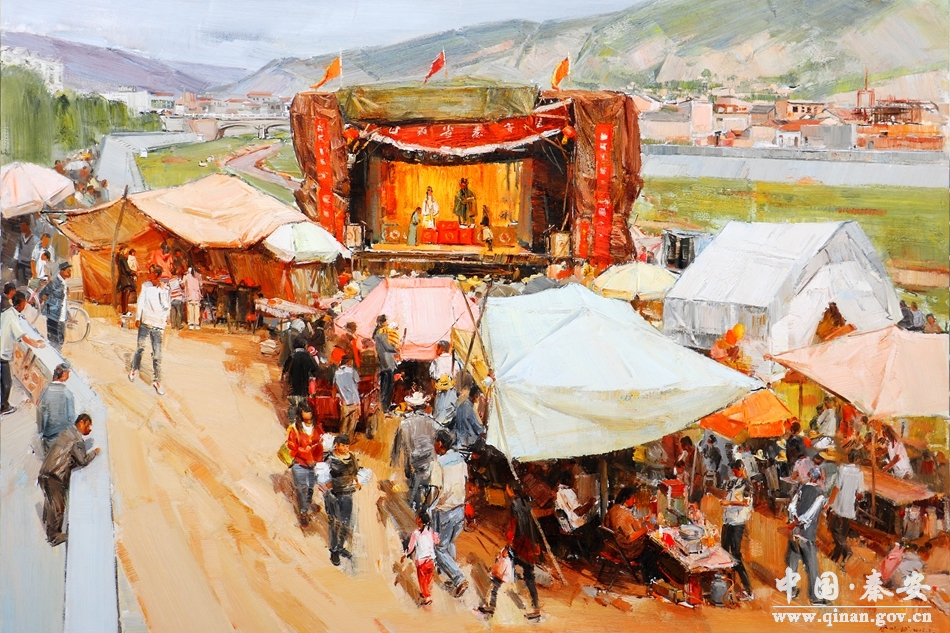 蔡晓斌,1983年9月生于秦安,2002年考入西安美术学院油画系中国精神工作室,师从著名油画家崔国强教授,现供职于秦安县文化馆。2018年创作的油画《南小河边的秦腔》题材选自秦安县南小河边唱秦腔的场景,以书写性的表现手法,展现了一副西北特色民俗画面,同时,画面饱含作者对这片地域深切的观察和审美思考,并将西北特有的厚重、质朴、开阔的精神融入其中。