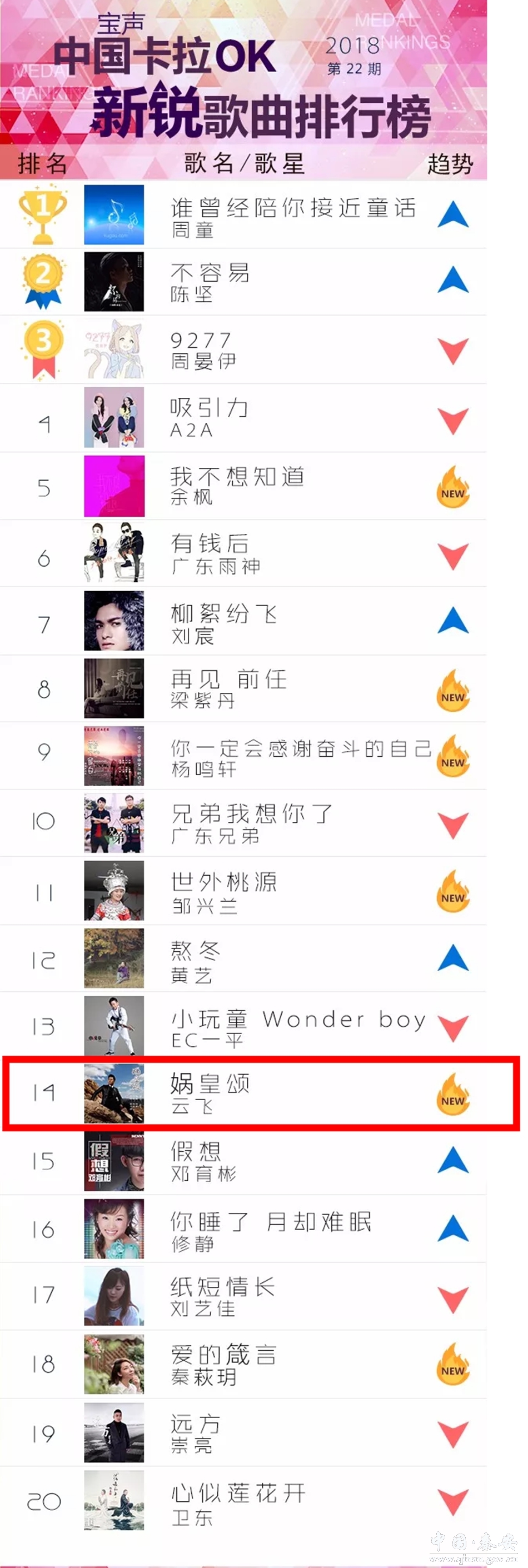 2018年6月21日,秦安县陇城镇万民空巷,庄严肃穆的女娲祭祀典礼现场,惊艳秦陇大地的《娲皇颂》再次响起,怀着无比虔诚之心的娲皇儿女在情深意长、苍劲灵动、绵延悠扬的赞歌声中追远怀古,共同感悟着人类始祖女娲抟土造人、炼石补天、肇启文明的丰功伟绩。就在当天,《娲皇颂》正式在中国卡拉OK入库上线,在2018年第22期“中国卡拉OK新锐歌曲排行榜中”位居第14位,这是全市唯一一首进入中国卡拉OK乐库宣传推介秦安的经典歌曲。