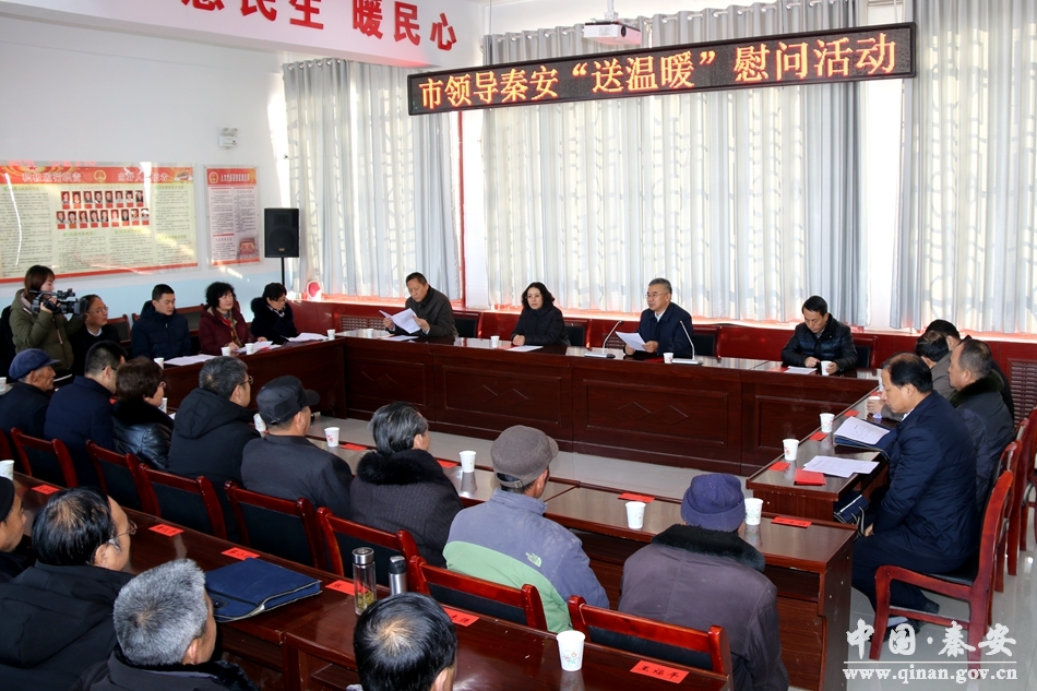 1月22日,在新春佳节来临之际,天水市委常委、常务副市长赵四辈,市政府副市长王燕,市政协副主席屈光平,市政府副秘书长左绍君带领市直相关部门负责人深入秦安县开展“送温暖”节前慰问活动。秦安县人大常委会副主任王蓉,县政府副县长文斌,县政协副主席路福太一同参加慰问活动。
