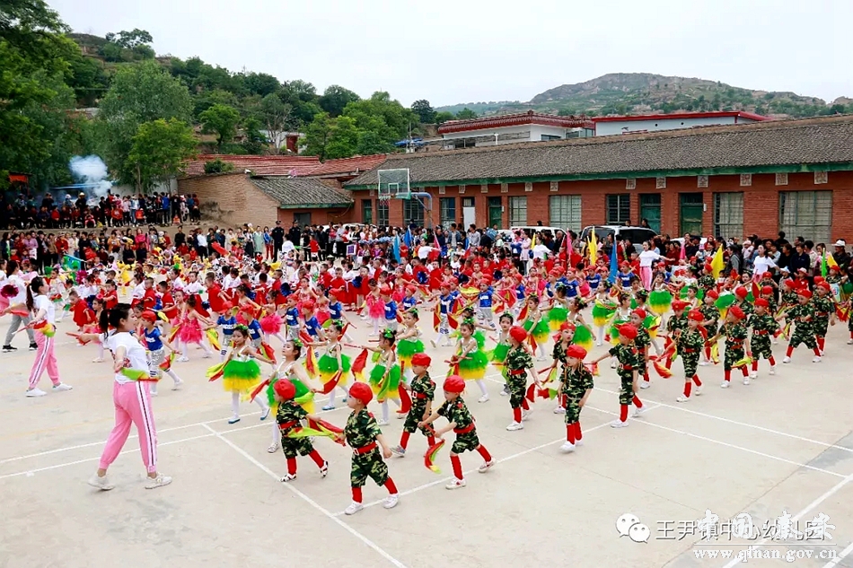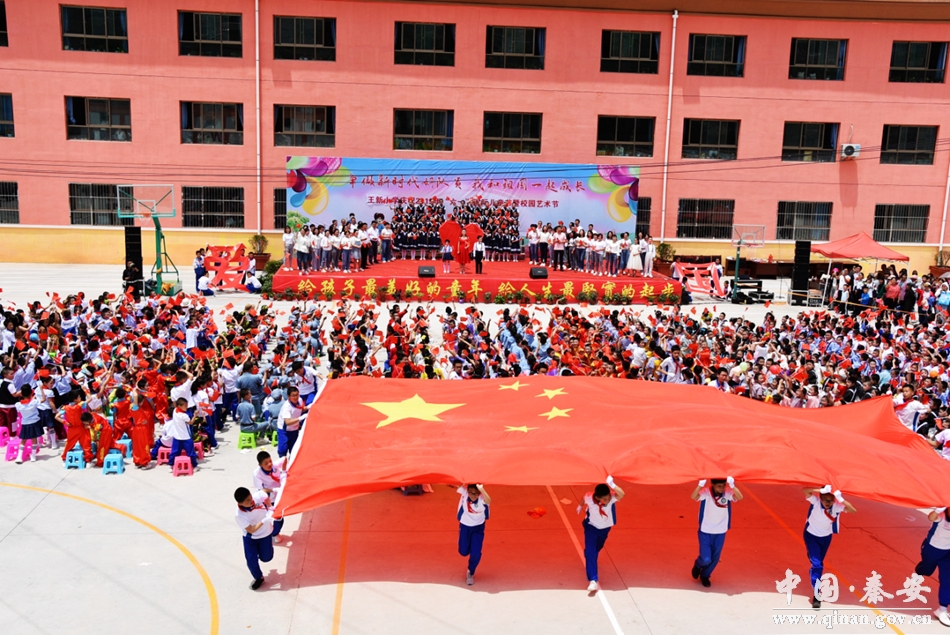 在王新小学的操场里,学生和家长们欢聚一堂,仪仗队的小朋友们扛着鲜艳的国旗,迈着整齐的步伐入场,伴随着激昂的国歌,五星红旗冉冉升起,随后,在欢腾的气氛中,小演员们身着节日的盛装,歌唱着、舞动着,以舞蹈、合唱、合奏等形式庆祝着自己的节日。
