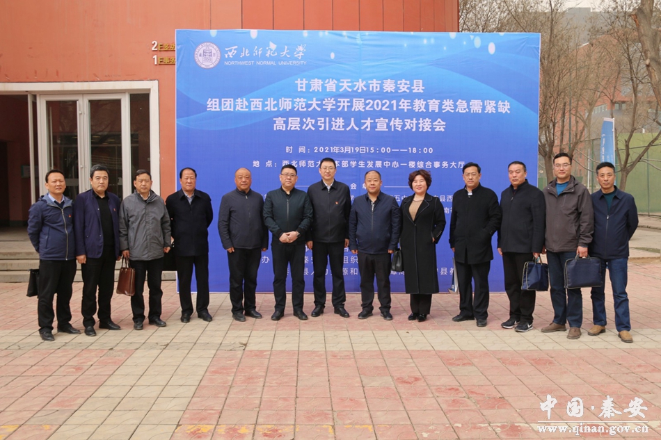 为进一步创新引才方式,拓宽引才渠道,提升引才效果,切实加强全县教育系统人才队伍建设。3月19日-3月20日,秦安县委常委、组织部部长许祖熙,县政府副县长丁迟成带领县委组织部、县委编办、县人社局、教育局等部门相关负责人及秦安一中、二中、五中,西川中学、秦安县职业中等专业学校、秦安县兴国中学、秦安县桥南中学负责人赴西北师范大学,开展教育类急需紧缺高层次人才引进宣传对接工作。