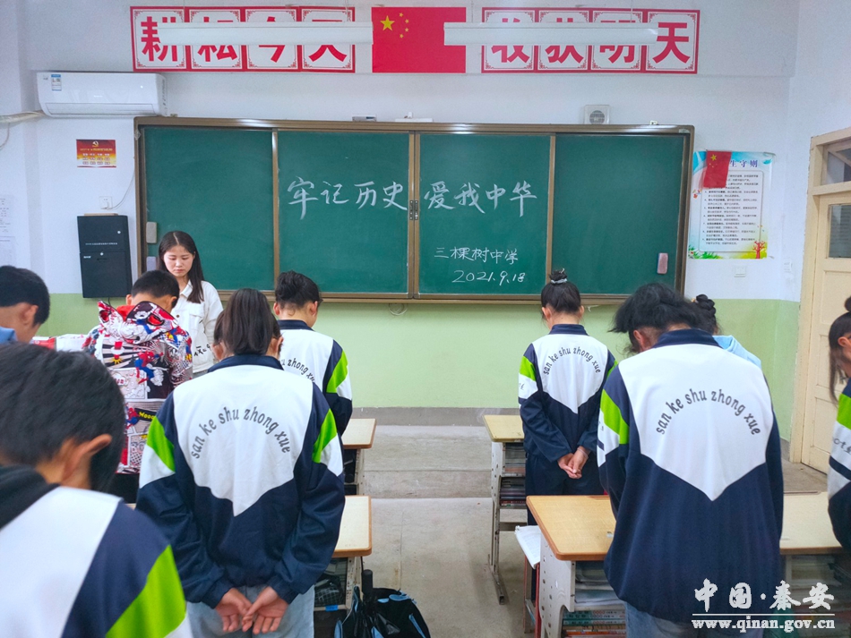 送教课开始之前,三棵树中学组织教师给九年级学生讲解了九一八事变,并组织学生进行了向在抗日战争中牺牲的先烈及被残杀的同胞默哀仪式。