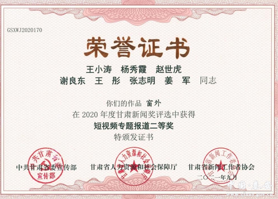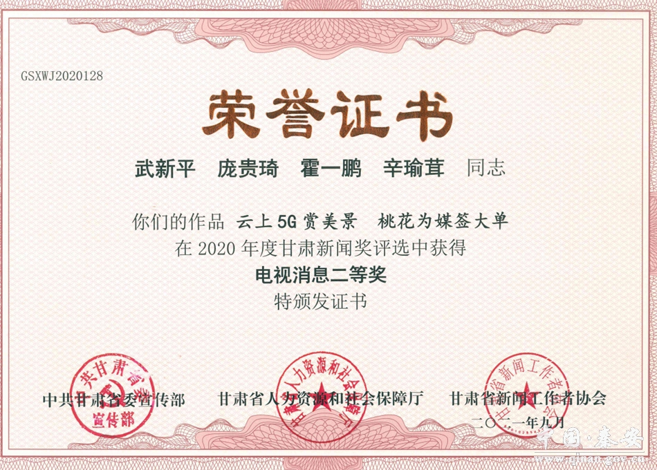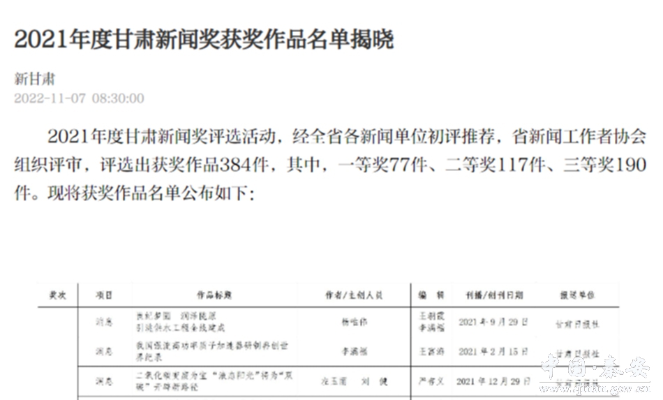 甘肃新闻奖是全省新闻界综合性年度优秀新闻作品的最高奖项,每年评选一次。2021年度甘肃新闻奖评选活动,经全省各新闻单位初评推荐,省新闻工作者协会组织评审,评选出获奖作品384件,其中,一等奖77件、二等奖117件、三等奖190件。