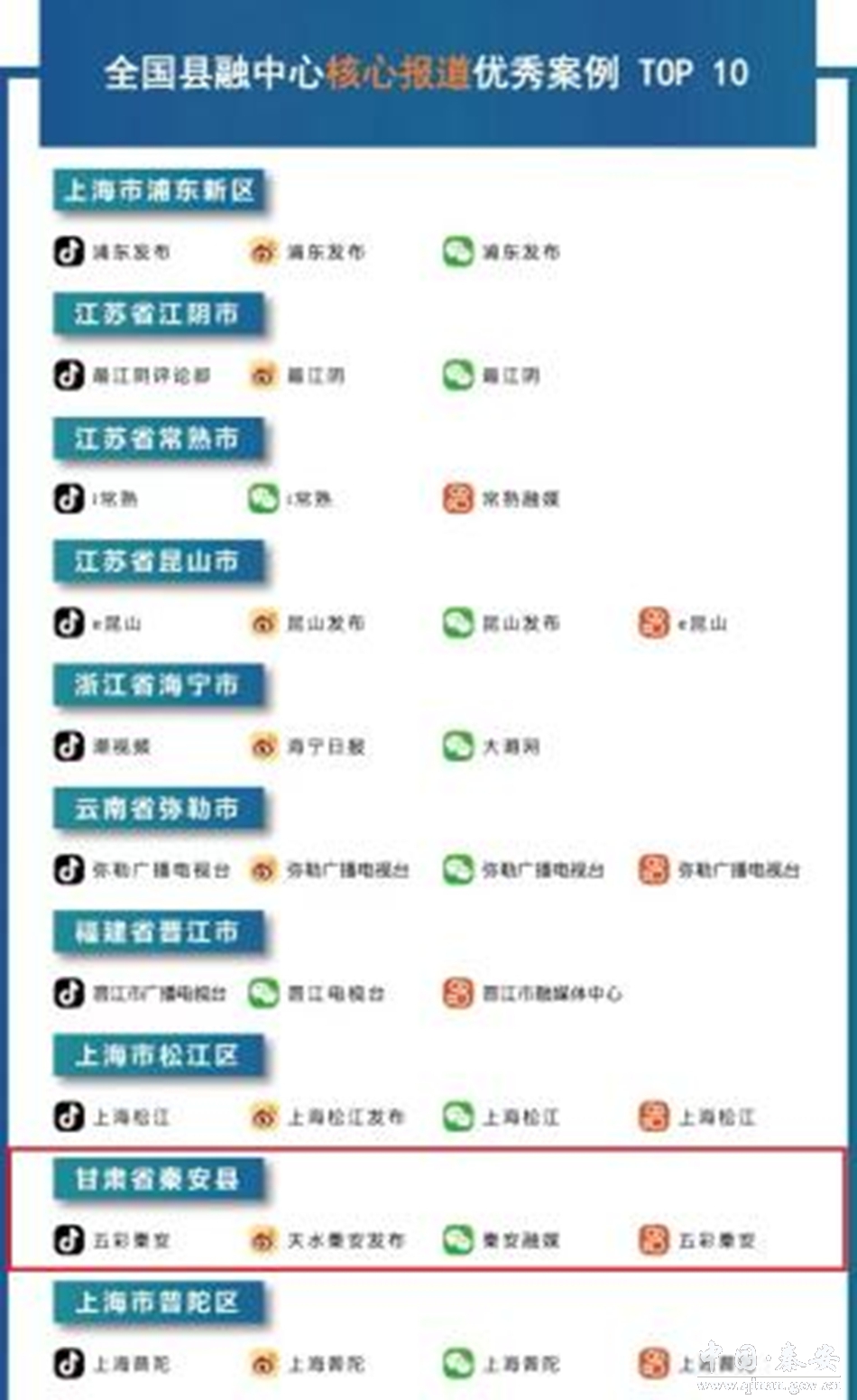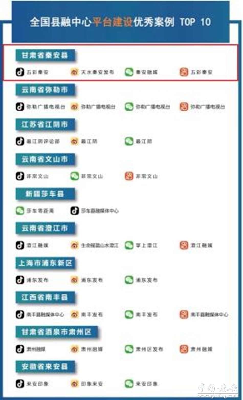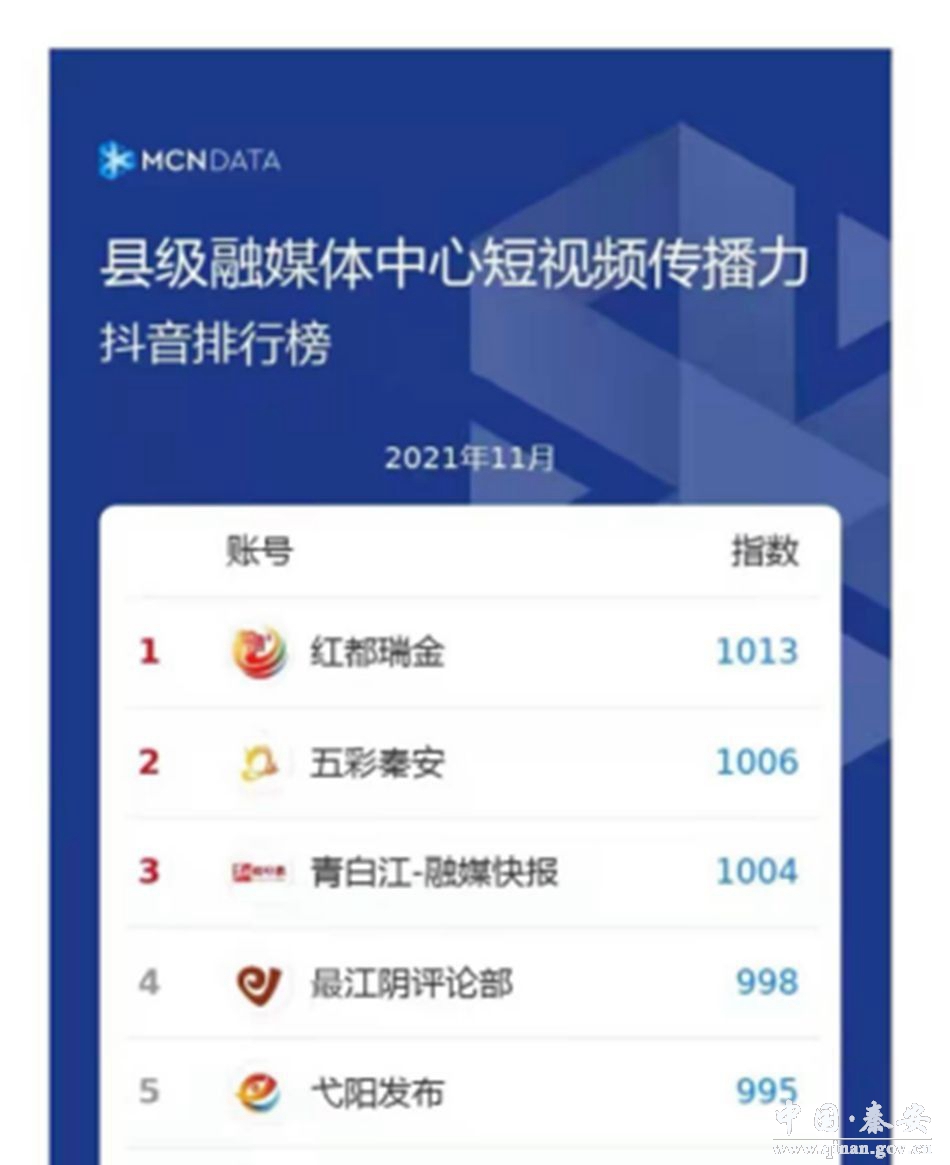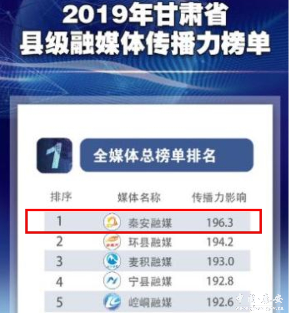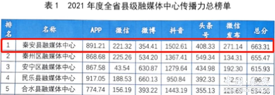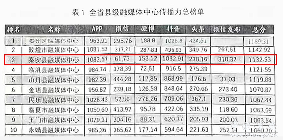 省委宣传部自2019年开始对全省各县级融媒体中心进行通联考评,考评以《阅评通报》的形式每季度下发,同时形成年终通报。全省县区融媒体中心传播力榜单由省委宣传部委托甘肃新媒体集团,通过传播力综合数据分析平台形成。榜单从客户端、微信、微信发布、抖音、快手、头条号以及微博进行数据采集和统计,分别对这7个维度的原创稿件、阅读、互动、篇均等多个指标分类细化、量化评估,根据目前媒体行业通用算法,形成各自子榜单。最后综合各维度指标数据和加权值,形成传播力榜单。秦安县融媒体中心在2019年、2020年、2021年分别获得甘肃省县级融媒体综合传播力榜单排名第一、第三和第一名的好成绩。