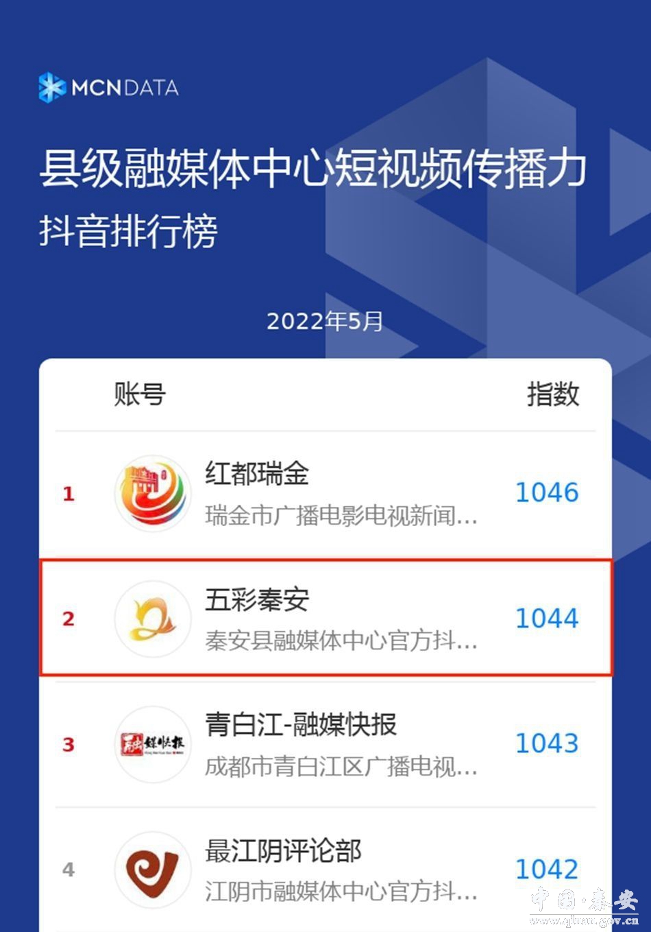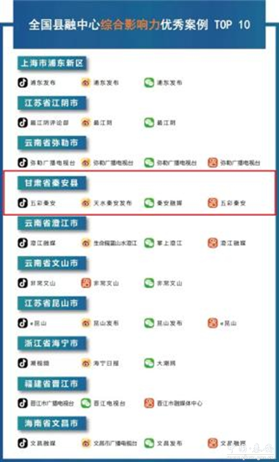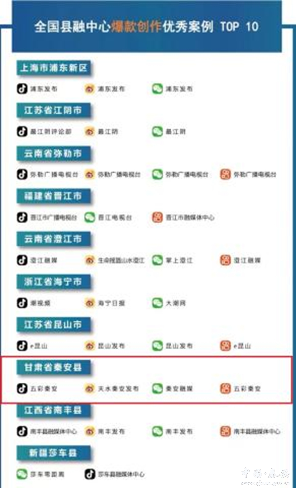 今年4月,新华社发布2022年第一季度全国县级融媒体中心五项优秀榜单。甘肃省只有三家县级融媒体中心榜上有名。秦安县融媒体中心凭借综合实力在“综合影响力”“平台建设”“爆款创作”“核心报道”四大优秀案例榜单中强档入围。秦安县融媒中心与上海浦东新区、江苏江阴市、云南弥勒市融媒体中心均摘四项大奖,并列榜首。今年5月,新华社发布第2期全国县融中心优秀案例(2022年4月份), 秦安融媒再次荣登综合影响力优秀案榜单。