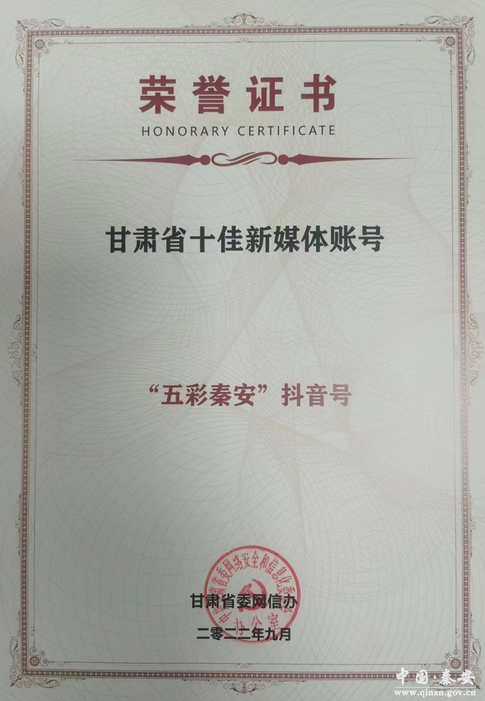 “五彩秦安”抖音号自2020年4月运营以来,因明确的账号定位、稳定的视频发布量、丰富的节目、持续的爆款生产,抖音号播放量突破1亿大关,并收到了抖音官方颁发的纪念奖牌和感谢信;2020年、2021年、2022年“五彩秦安”抖音号连续三年获得短视频传播力榜单全国第二;在2022年甘肃省网络文明推进大会暨网络文明宣传月活动上,秦安融媒“五彩秦安”抖音号荣获甘肃省十佳新媒体账号;在全省县级融媒体抖音平台中各项综合指数位居榜首,在全国县级融媒体抖音平台中粉丝数量位居第一。至目前,“五彩秦安”抖音号共发布短视频18000余条,获点赞 2.3 亿,粉丝数828.9万。创单条浏览量最高达9651.4万、单条点赞最高达296.7万、日增粉丝量最高达6.8万、单条浏览量上千万作品达到2000多条的良好纪录。