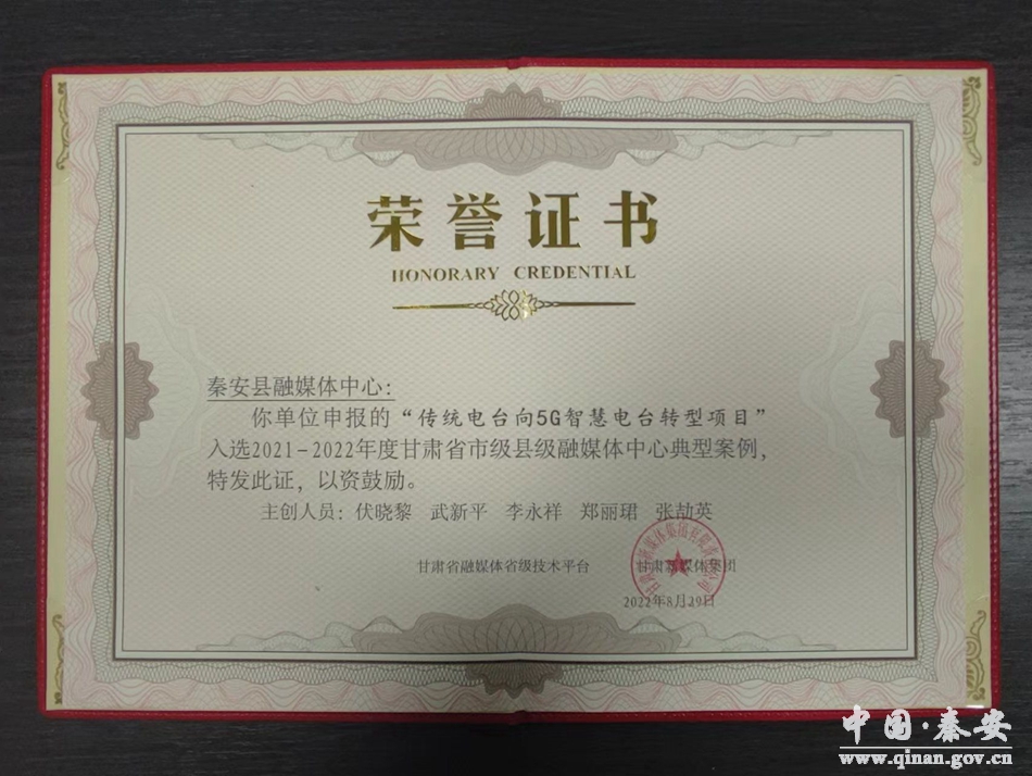 此外,2021年,秦安融媒5G智慧电台荣获基层传播智慧广电先进单位;2022年8月,秦安融媒传统电台向5G智慧电台转型项目入选2021—2022年度甘肃省市县融媒中心典型案例。2021年5月,秦安融媒荣获2020年度全省县级融媒体中心优秀融合案例创新发展奖和融合传播奖。
